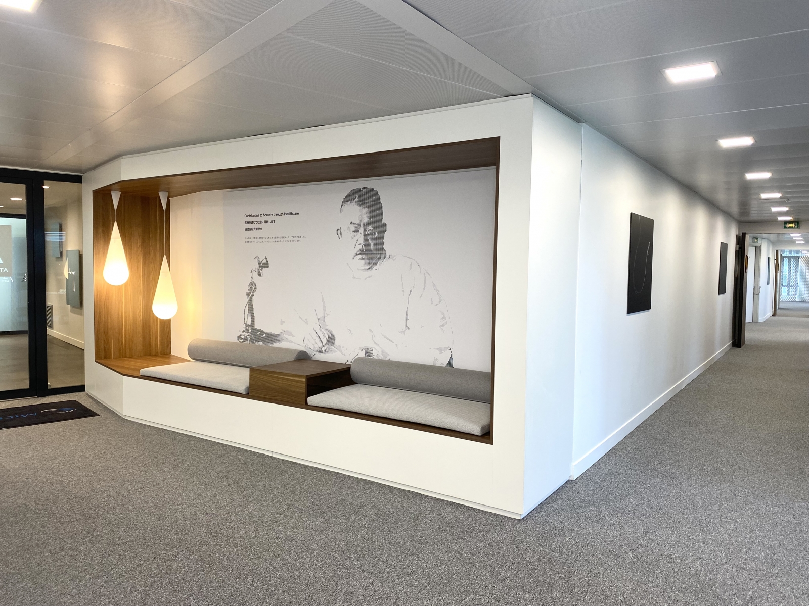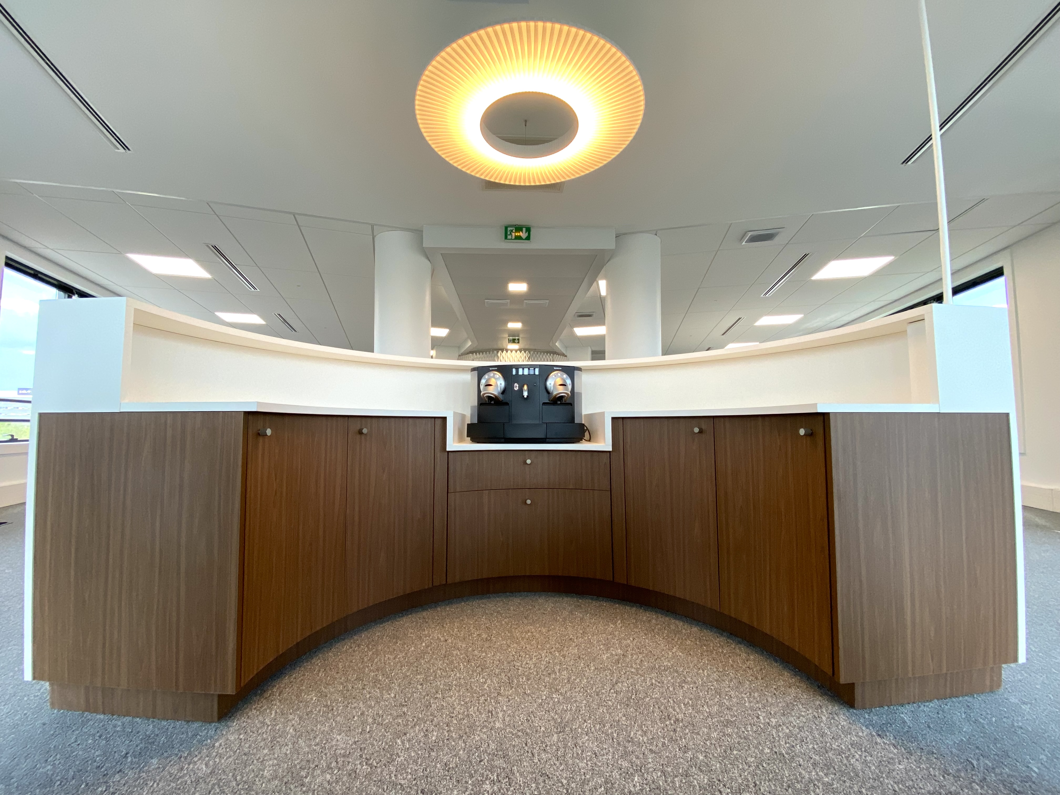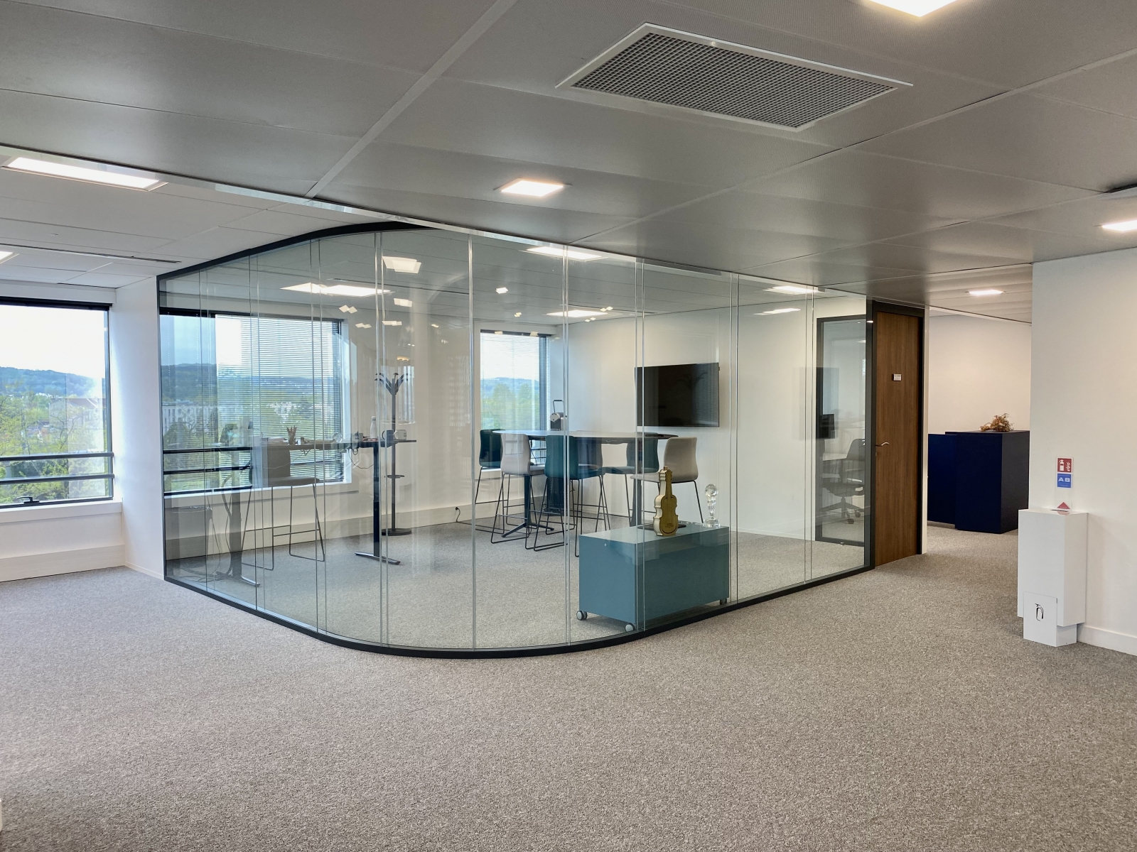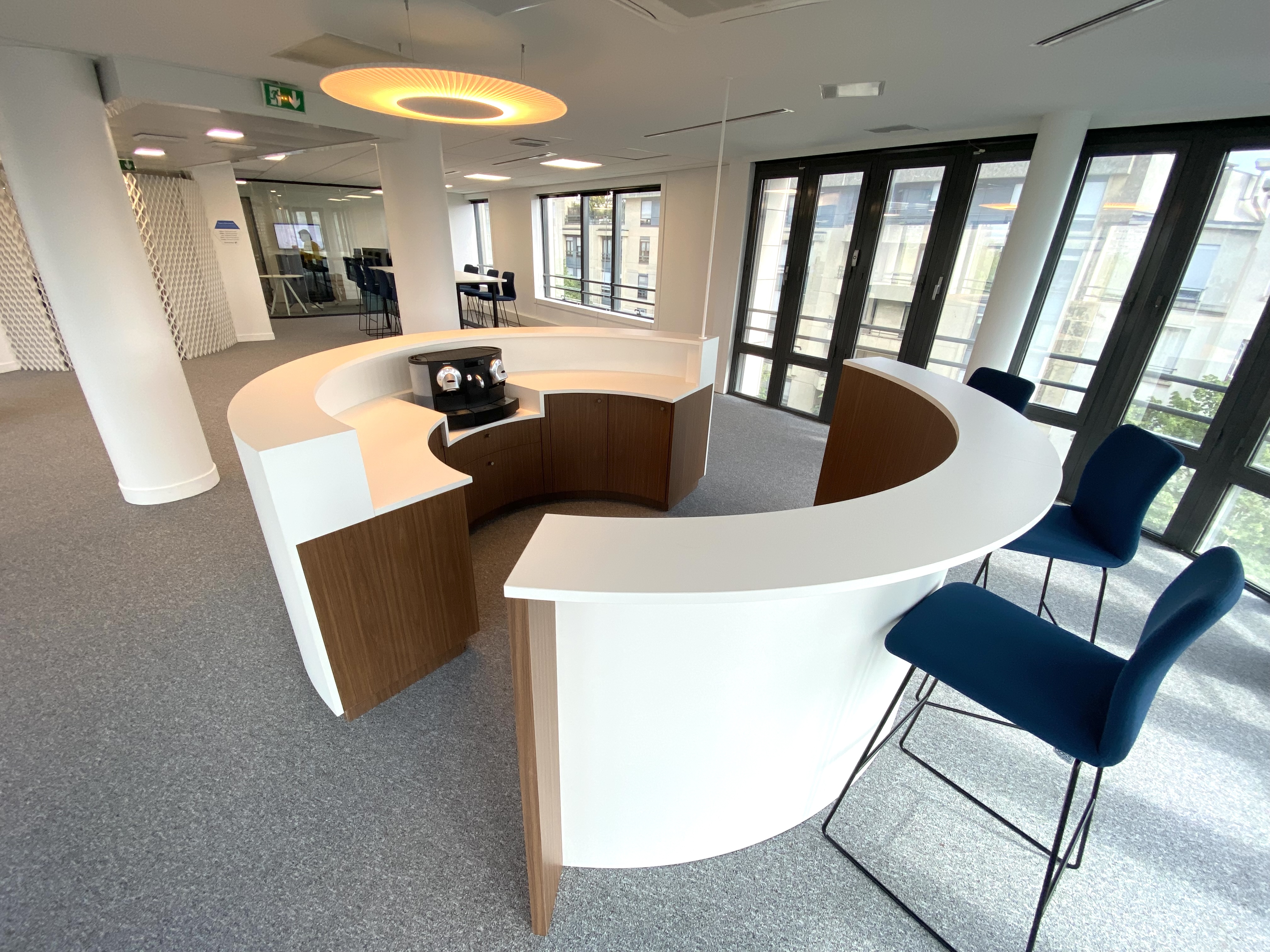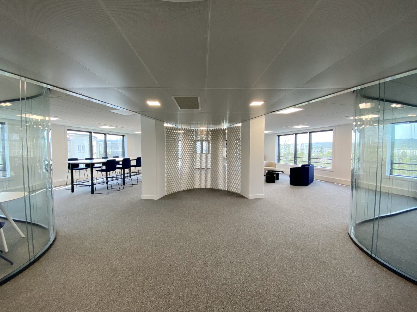 Etude architecturale / Courant fort et faible / Cloison et vitre cintrée / Revêtement de sol / Décoration et mobilier / Bureaux assis-debout